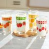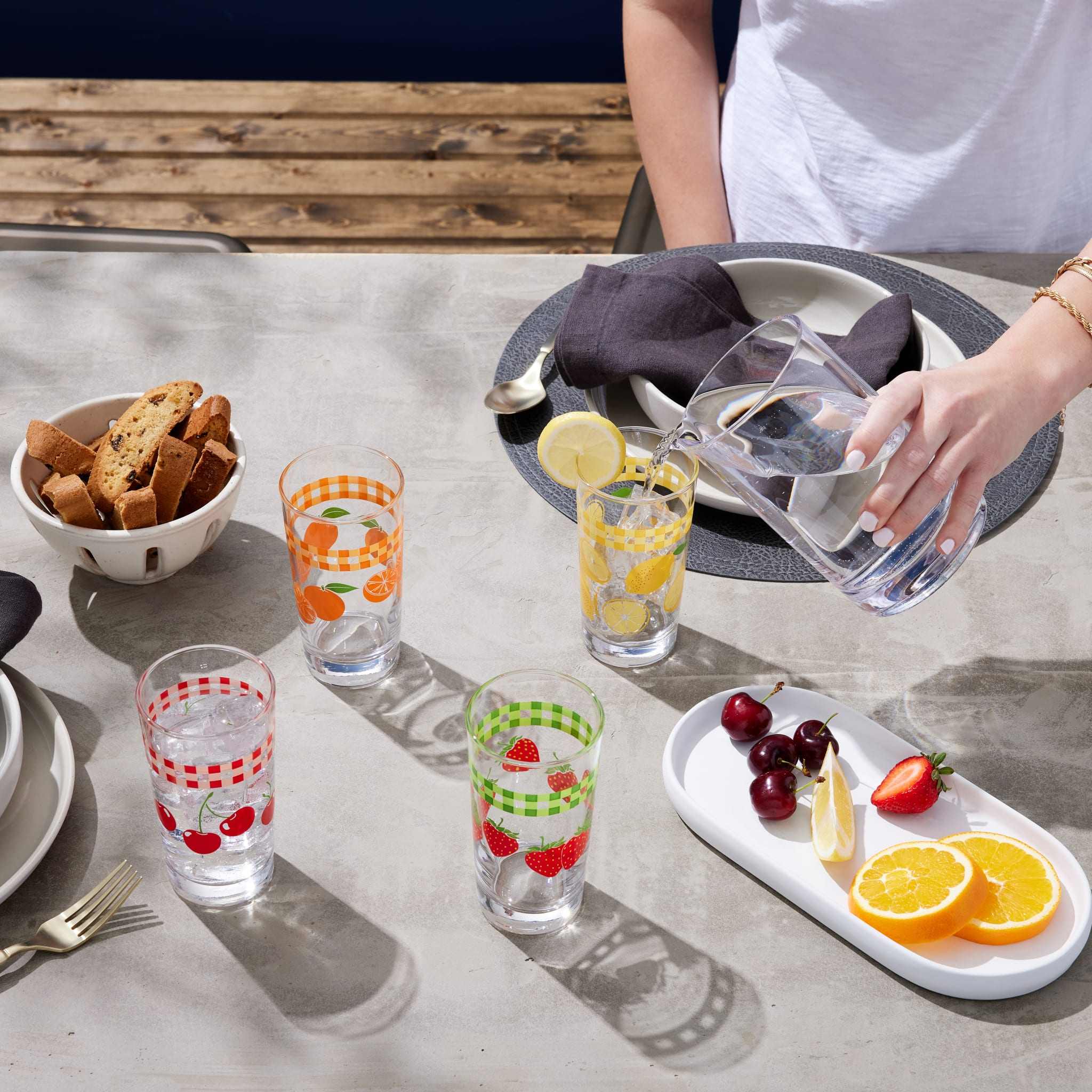 - Heavy base juice glasses with assorted colorful fruit designs and gingham border
